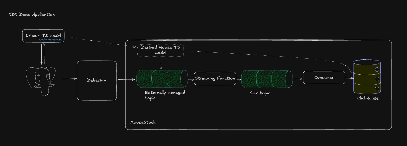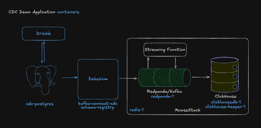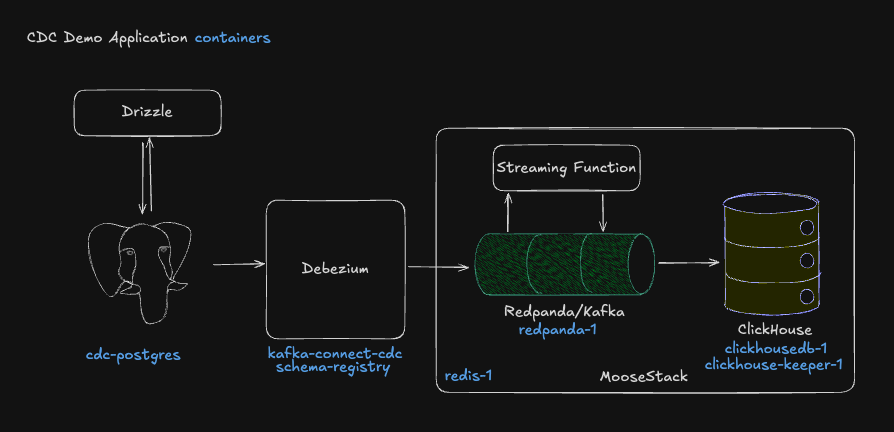 Why MooseStack: Everything lives in code—from CDC streams through to OLAP tables. Moose dev server makes it trivial to spin up the full pipeline (ClickHouse, Redpanda, and your OLTP infrastructure too) locally in seconds.