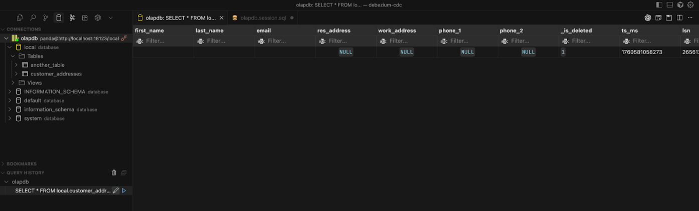 You can see the data in ClickHouse using your IDE’s database client. You can find the instructions for connecting to your local ClickHouse in the MooseOLAP docs. The deleted row CDCd from above is shown rationalized in ClickHouse in the screenshot be