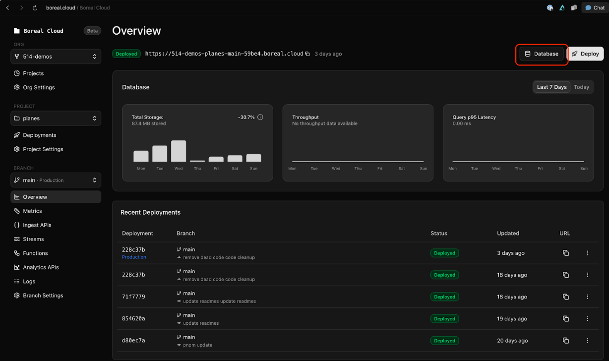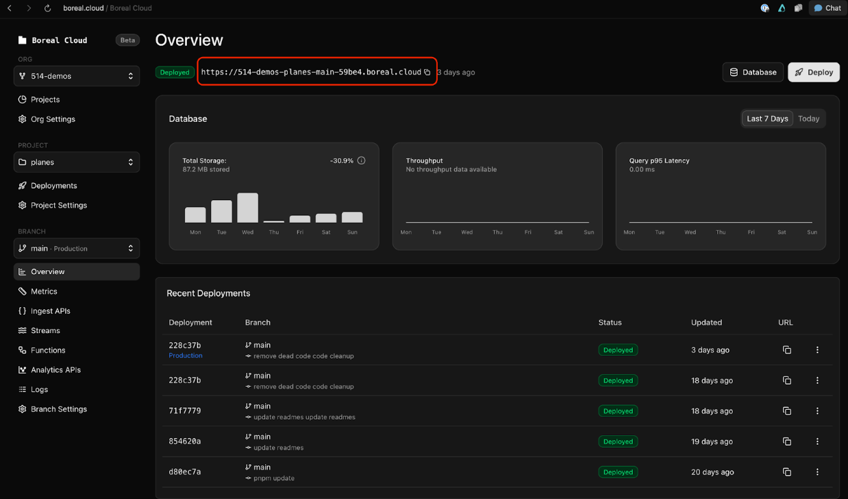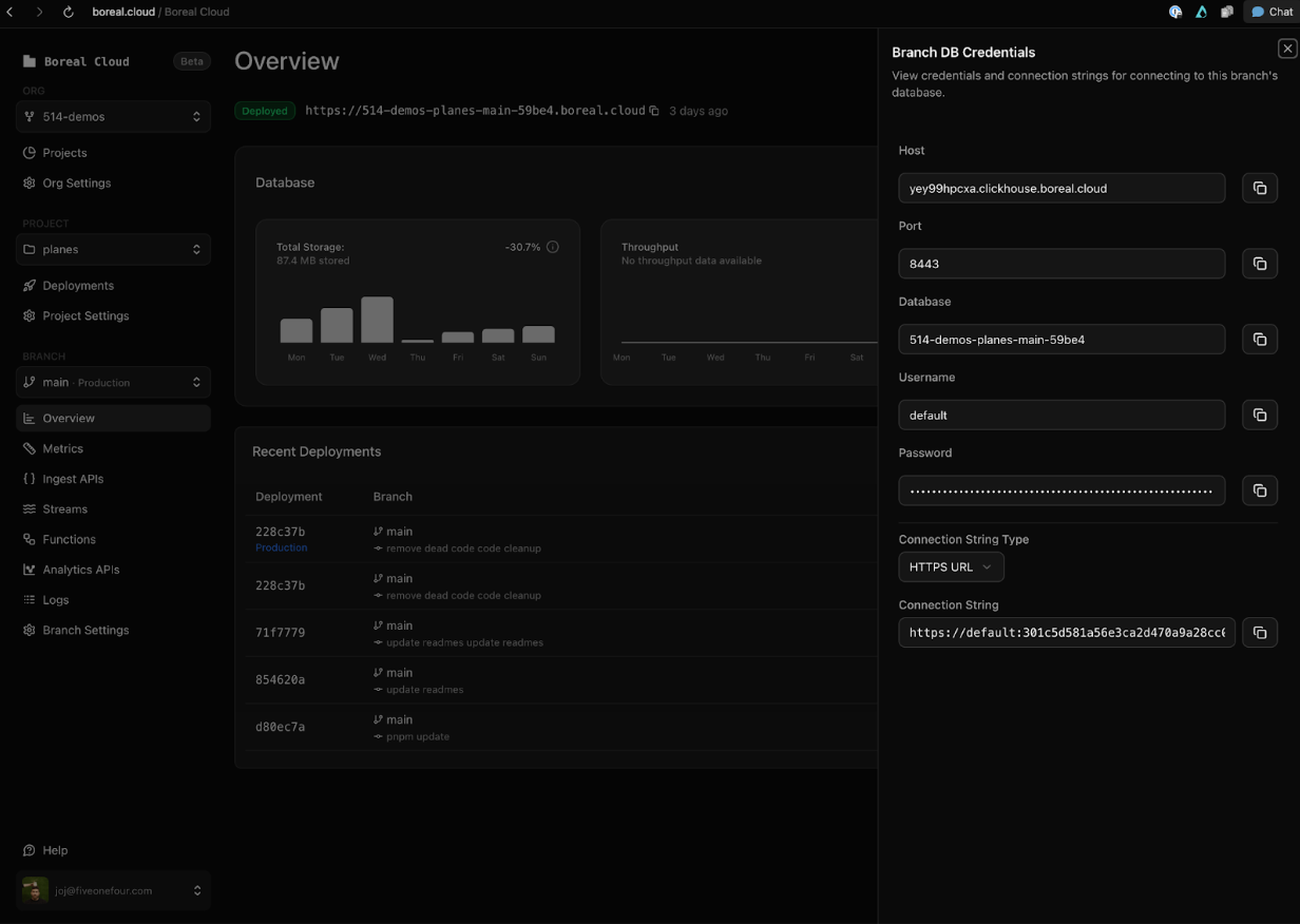 You now have a fully fledged NextJS application, with charts, and chat, running off a production-scale ready MooseStack back end on Boreal.