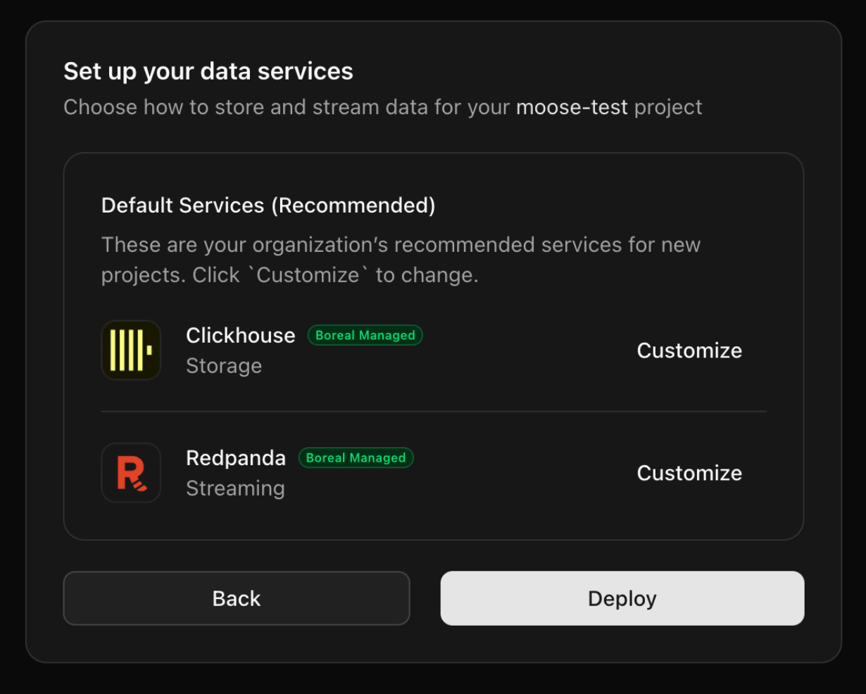 Continue, selecting Boreal default hosting (or point it at your own managed ClickHouse and Redpanda instances if you like).
