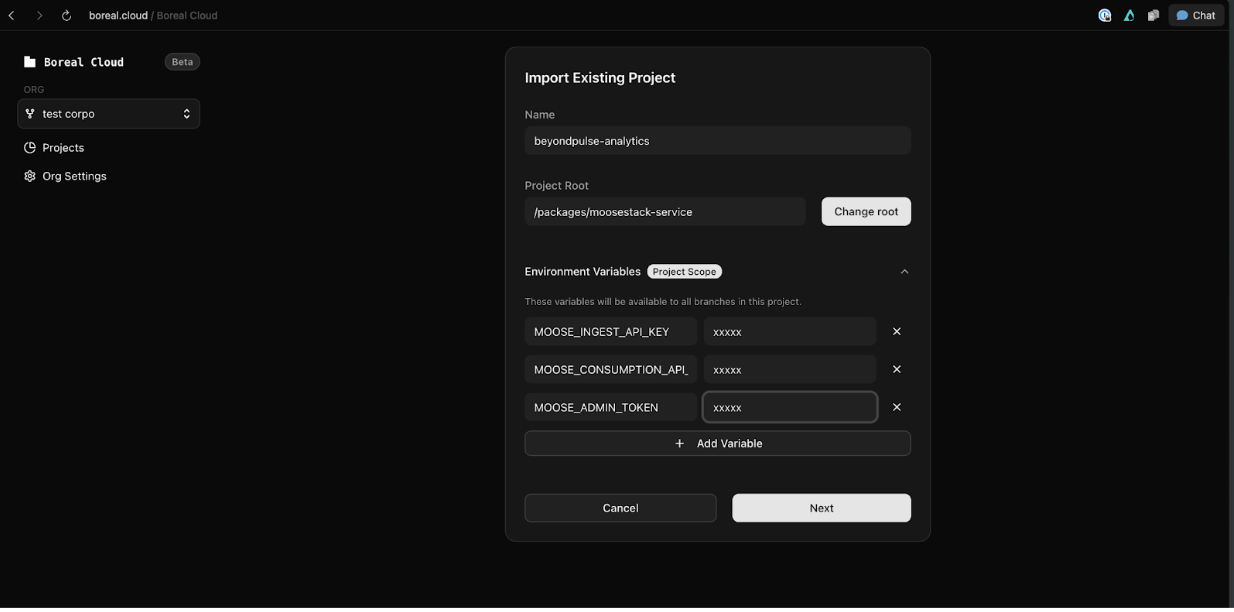We’ll prepare the application for deployment by setting up authentication, then deploy the MooseStack application to Boreal, and the web-app to Vercel. You can set up authentication and hosting to your preferences, if we haven’t covered your preferred option in our docs, reach out in our slack community: https://slack.moosestack.com/. Authentication was covered in the start of this guide, but covers Back End to Front End authentication only (you should also add authentication to your frontend).