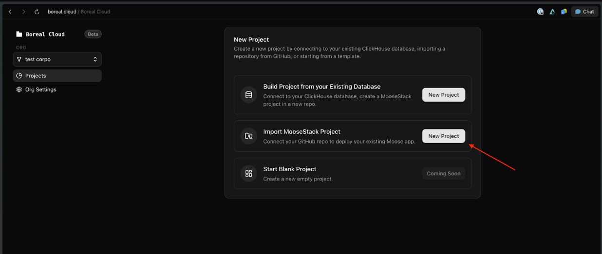 Finding your Boreal MooseStack endpoint URL (it is right at the top of the project overview page):