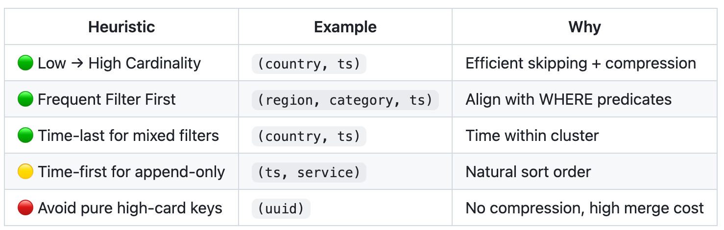 Time is a really interesting field in OLAP analysis. It’s high cardinality, but also one of the most common filters. For append-only data (like telemetry or logs), sorting by time first often makes ingestion cheaper and queries faster, the natural order matches insert order.